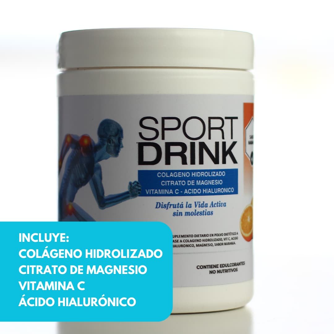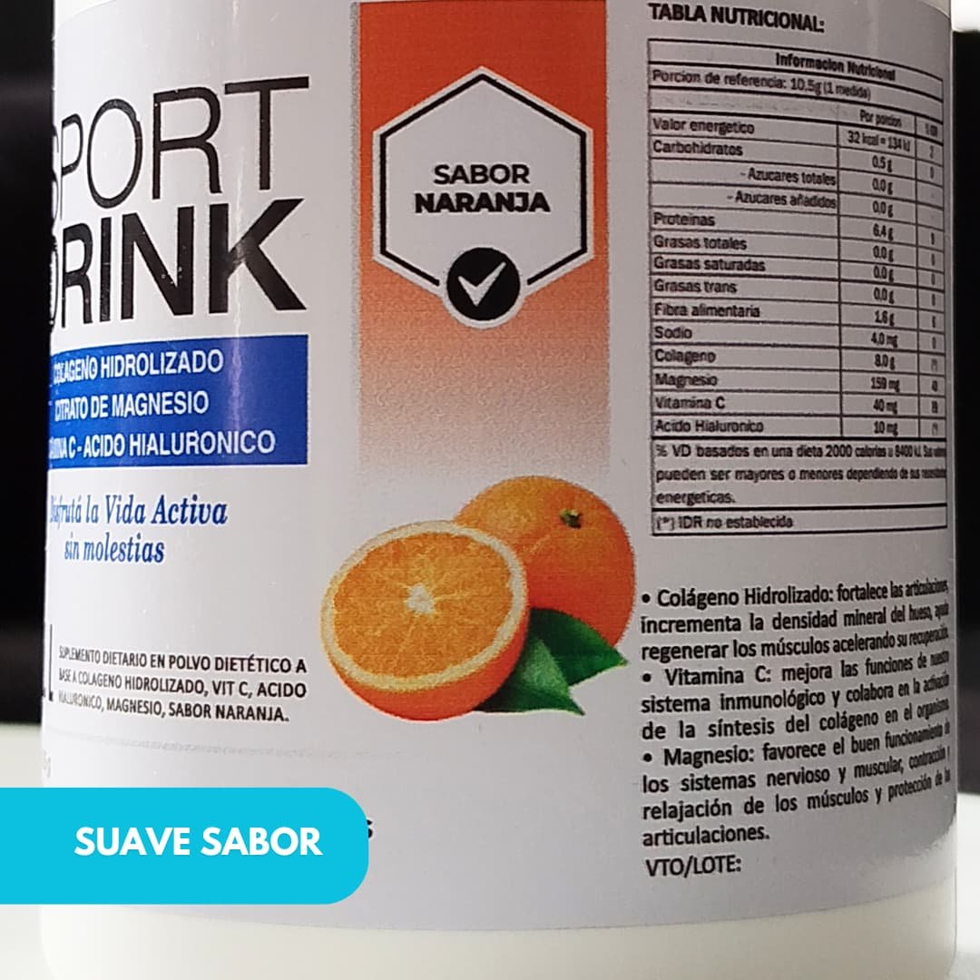 SPORT DRINK es un suplemento dietario en polvo a base de colágeno hidrolizado, magnesio, ácido hialurónico y vitamina C. Sabor naranja.